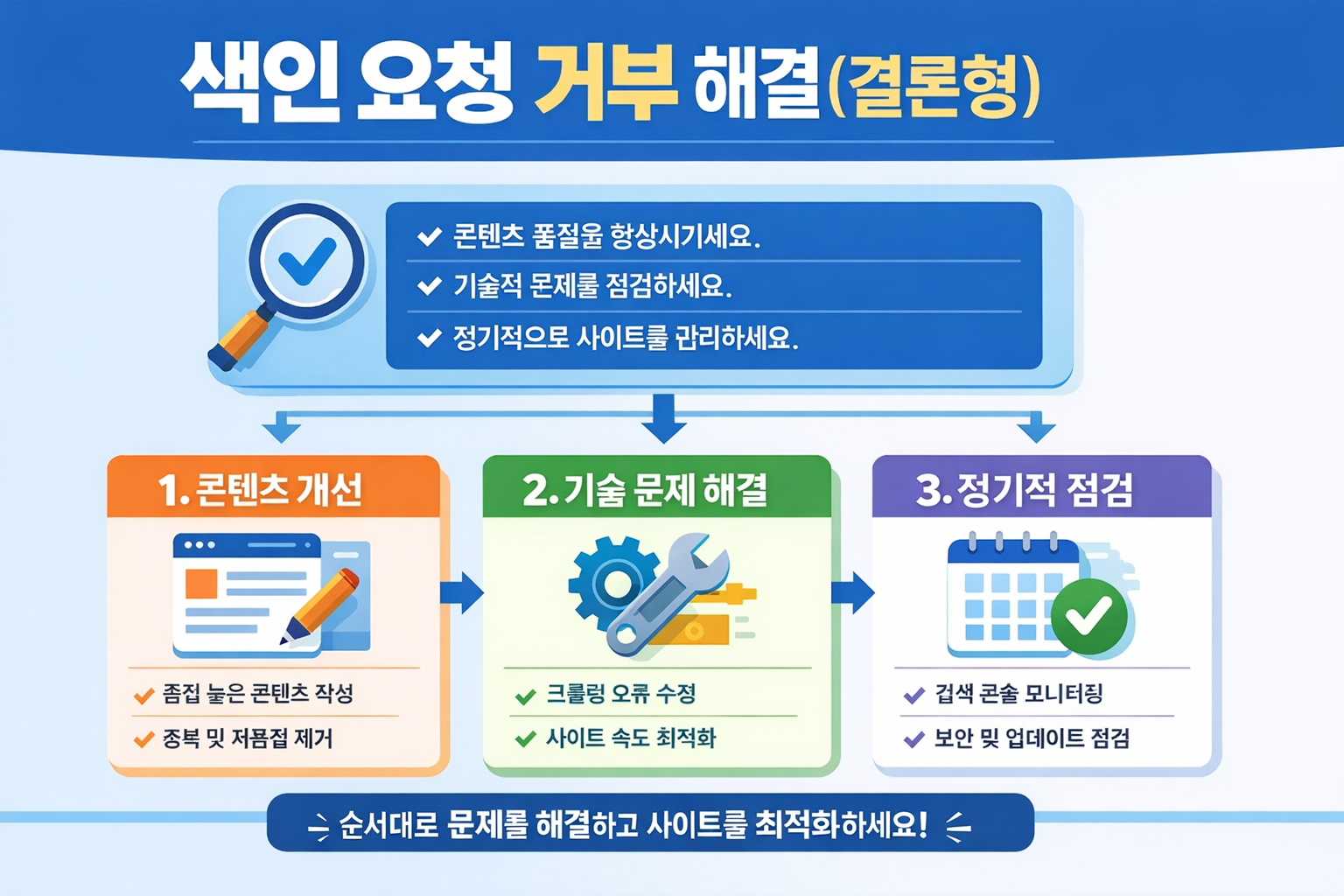 티스토리용 색인 생성 요청 거부 해결 결론형 인포그래픽 결론 3줄입니다.